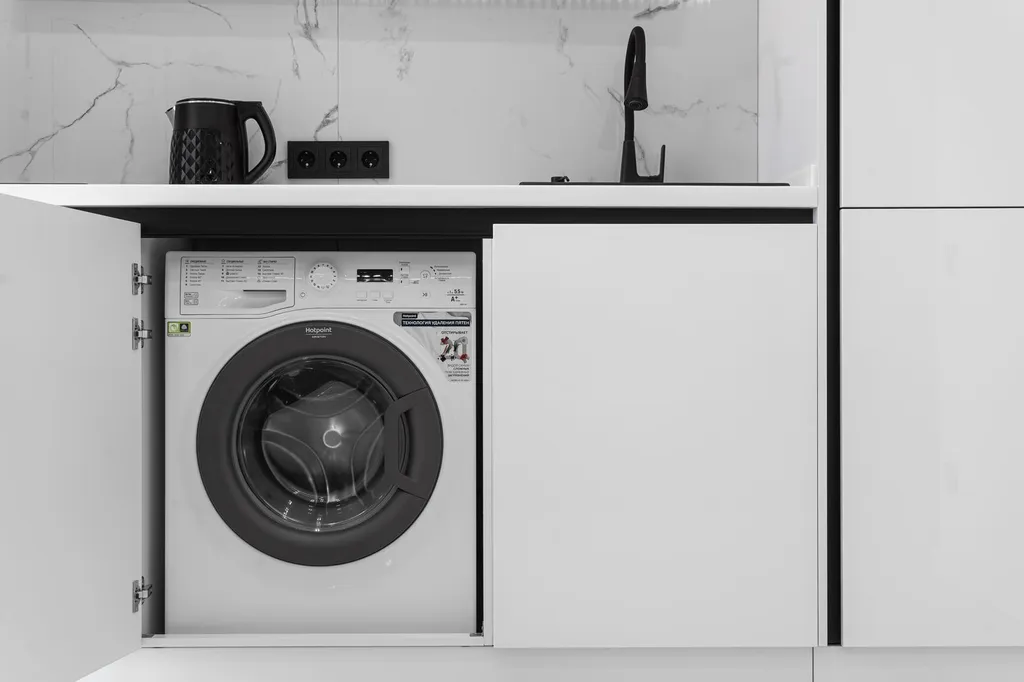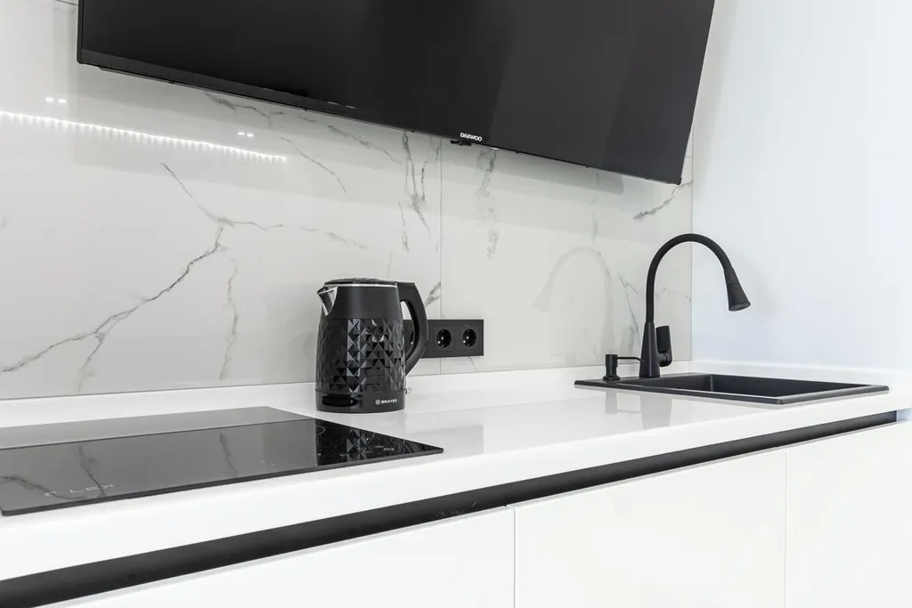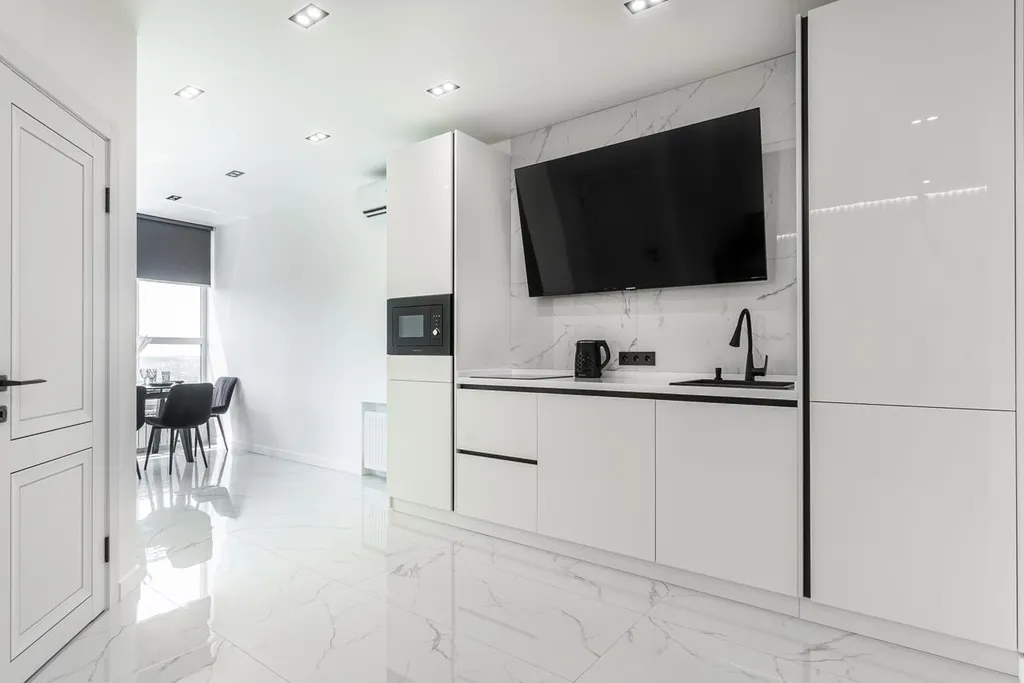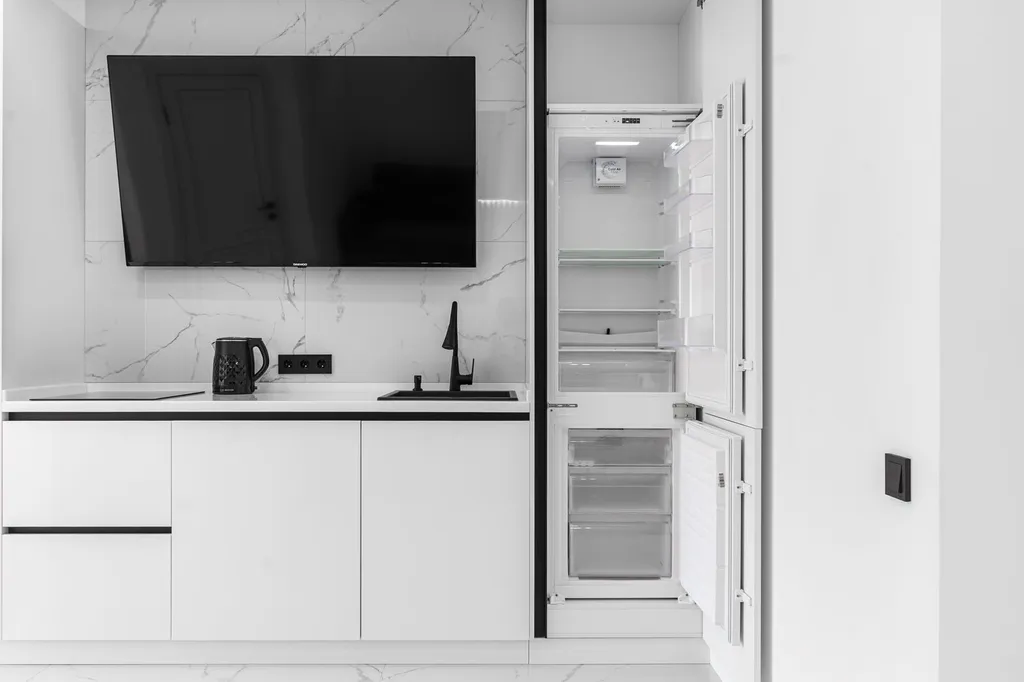 Новая современная встроенная кухня, встроенный холодильник, микроволновка, стиральная машина, огромный телевизор с функцией Smart TV, Wi-Fi.