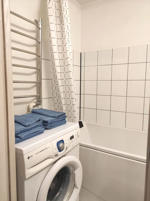 - Стиральная машина, микроволновка, варочная панель, духовой шкаф, сплит-система, телевизор с приставкой Smart TV, чайник, хорошая посуда, утюг, сушилка;