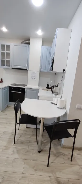 Удобную укомплектованную кухню с обеденной зоной.