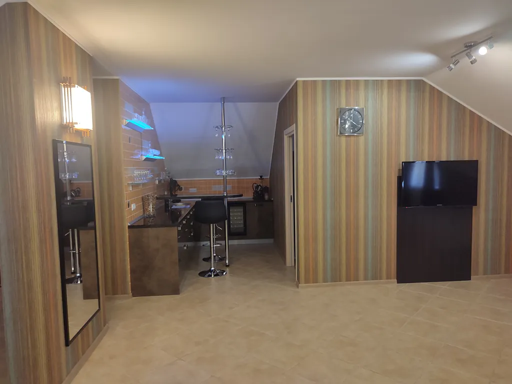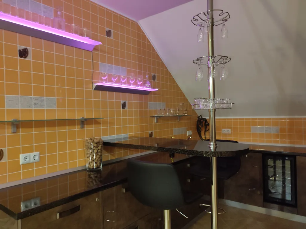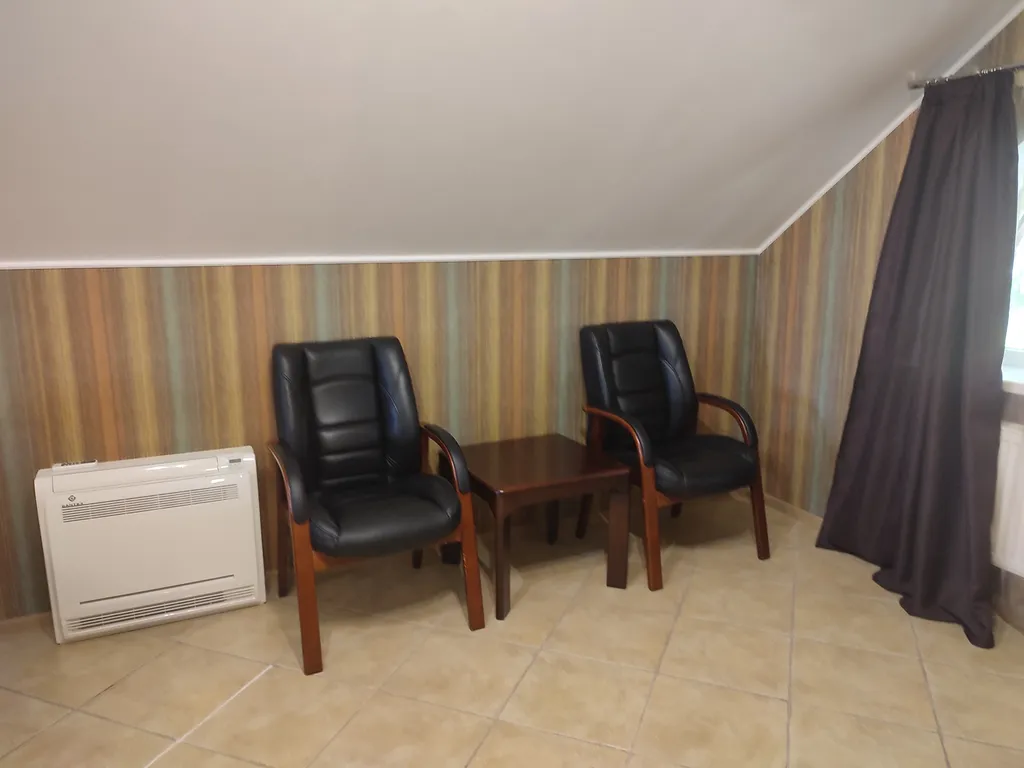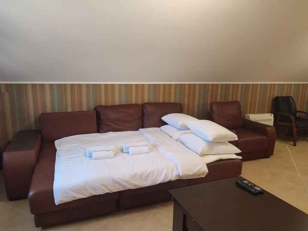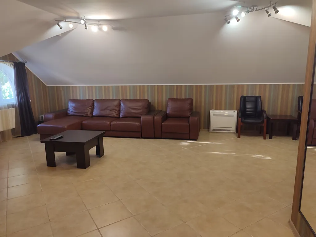 На первом этаже дома расположена кухня, сан. Узел, душевая комната и сауна (оплачивается отдельно) с зоной отдыха. На втором мансардном этаже находится отдельная спальня с двуспальной кроватью и просторная гостиная с мягкой мебелью (2 спальный диван) +1 доп. Место (раскладная кровать)