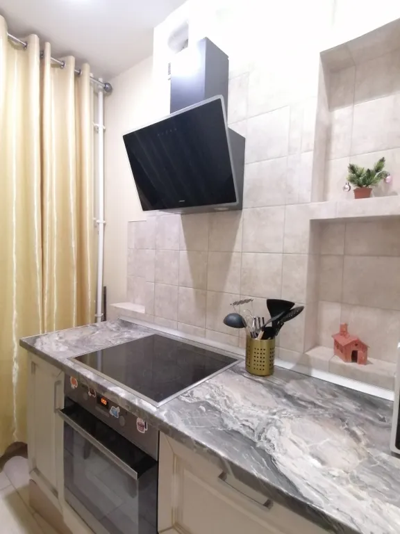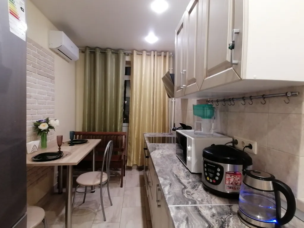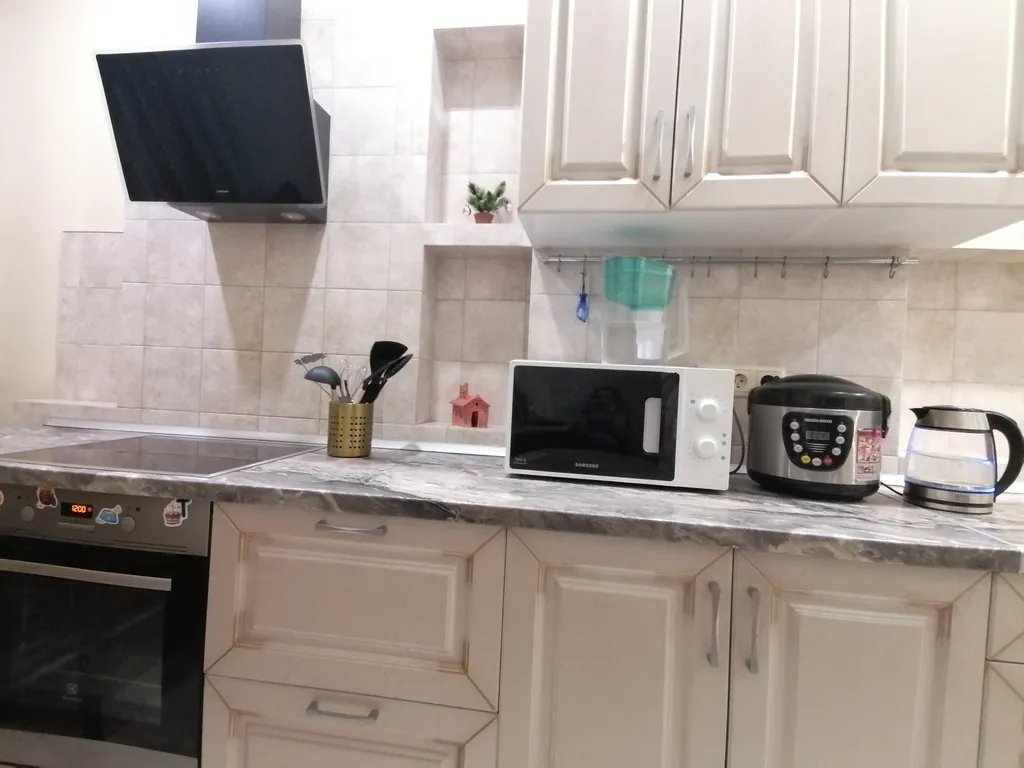 Кухня: холодильник, плита, чайник, микроволновка, посуда