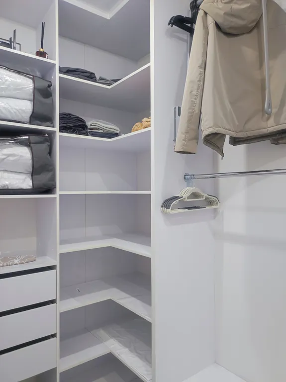 Имеется отдельная большая гардеробная для вещей, сумок, чемоданов, что способствует ощущению постоянного порядка.