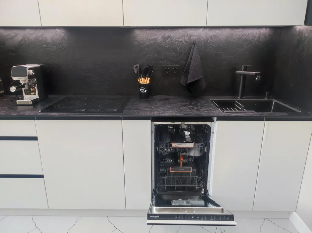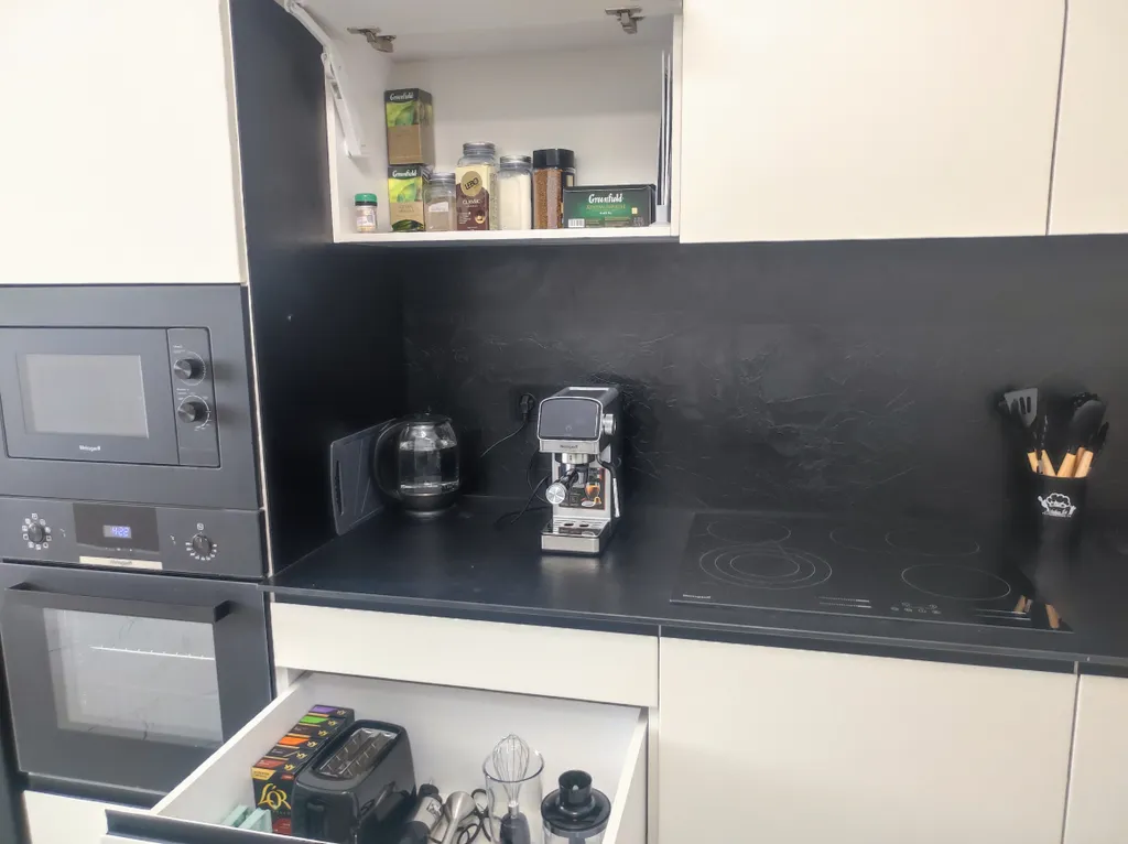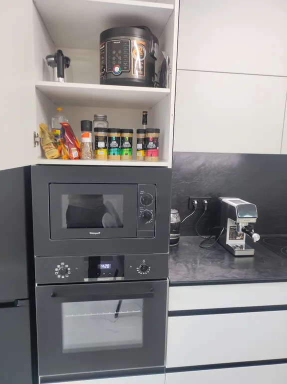 Кухня оборудована по последнему слову техники: холодильник, плита, духовка, вытяжка, микроволновка, мультиварка, тостер, миксер, чайник, кофемашина, посудомойка , кулер с охлаждением и подогревом воды.