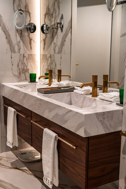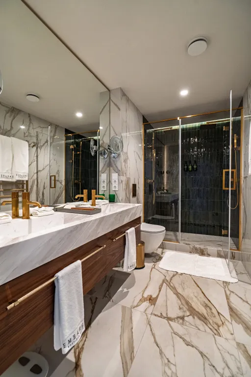 Просторный санузел с ванной и двумя раковинами