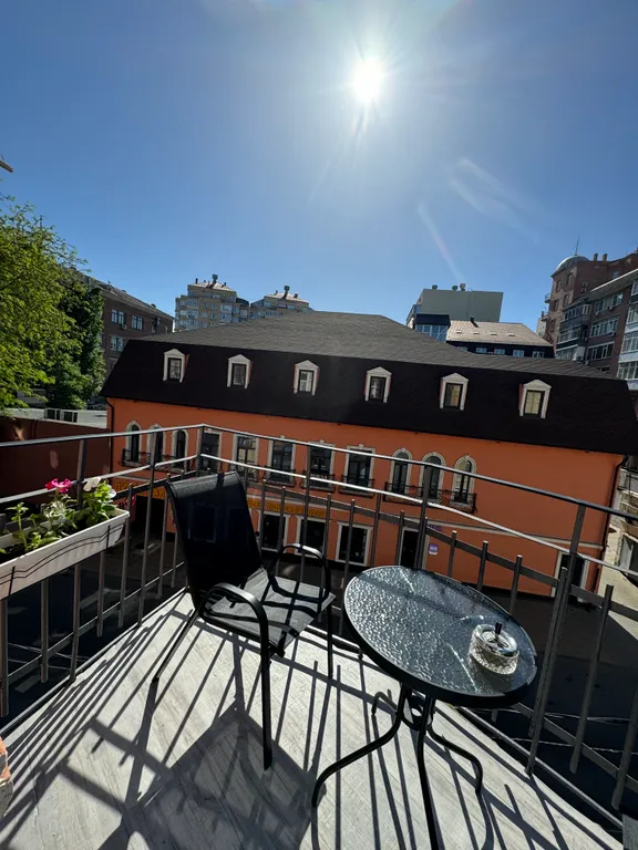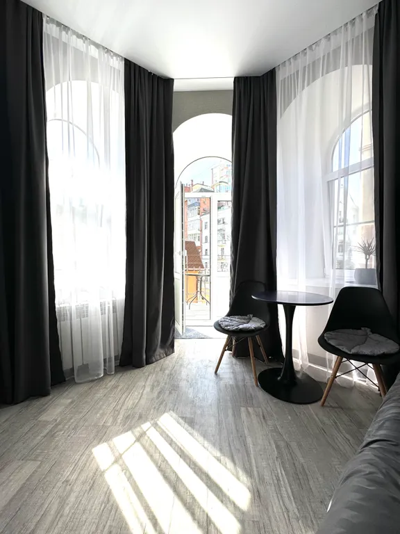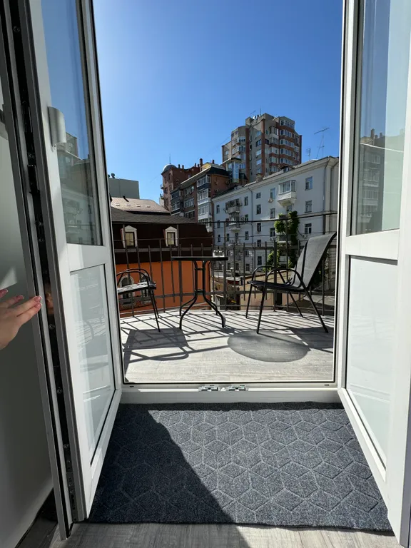 Удобный двухспальный раскладной диван, телевизор, сплит-система, шкаф для одежды, обеденная зона со столом и 2мя стульями, столешница, холодильник, микроволновая печь, чайник, набор посуды, утюг, фен, вешалка для верхней одежды. Балкон открытый с видом исторический центр ростова, переулок газетный. На балконе расположены столик, 2 полукресла и пепельница.