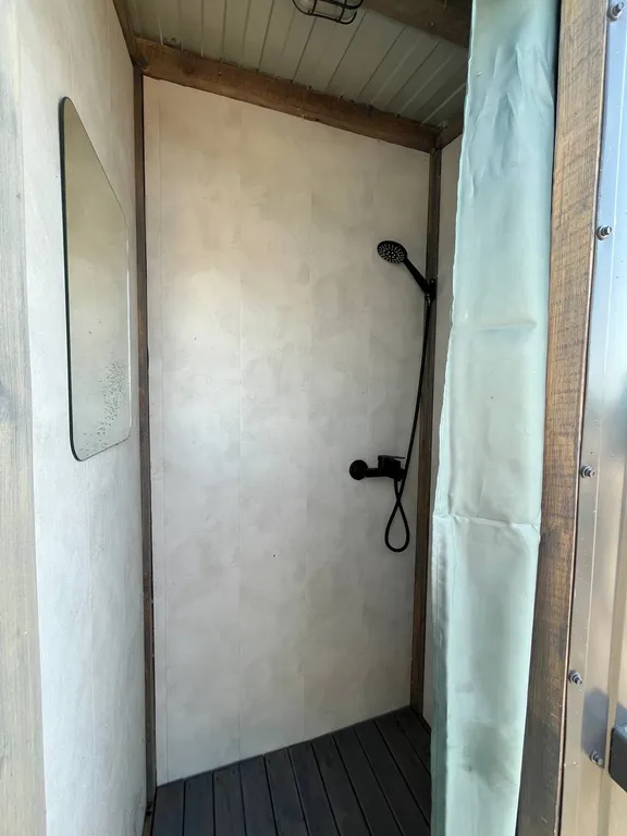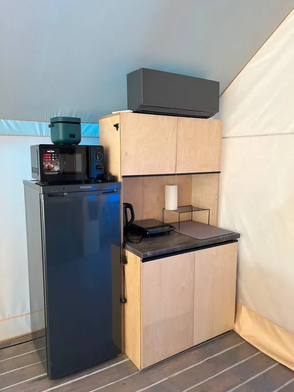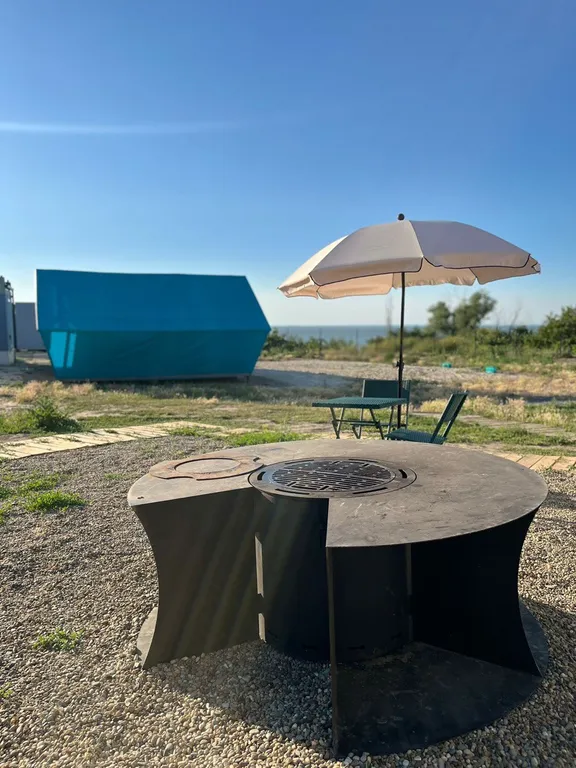 Кухонная зона с посудой, холодильником, микроволновкой, индукционной печью мультиваркой. Раковина с горячей и холодной водой на террасе