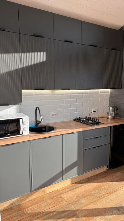 Кухня, оборудованная холодильником, микроволновой печью, индукционной плитой и посудой для сервировки стола