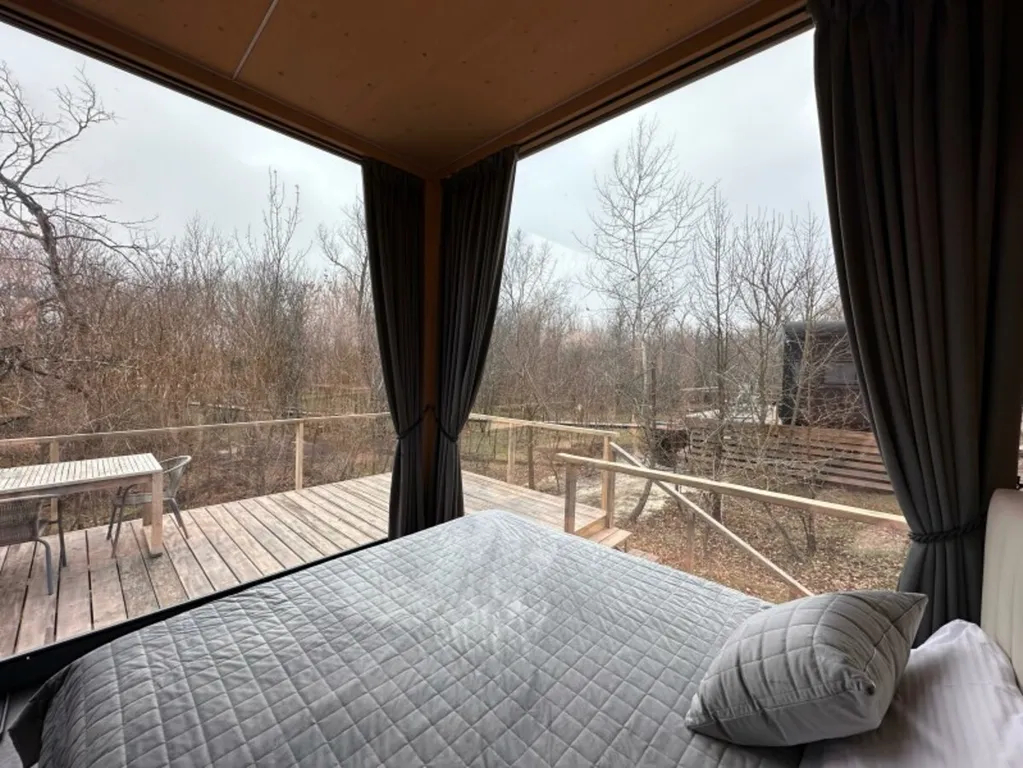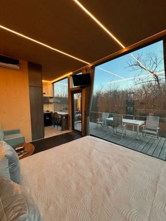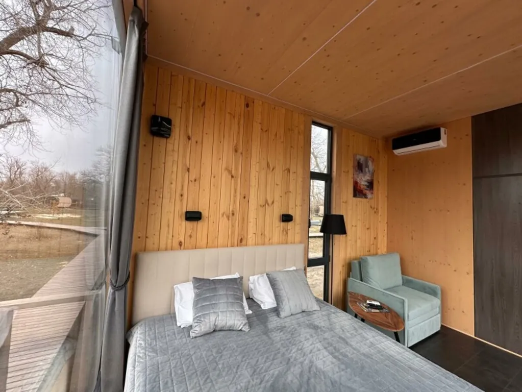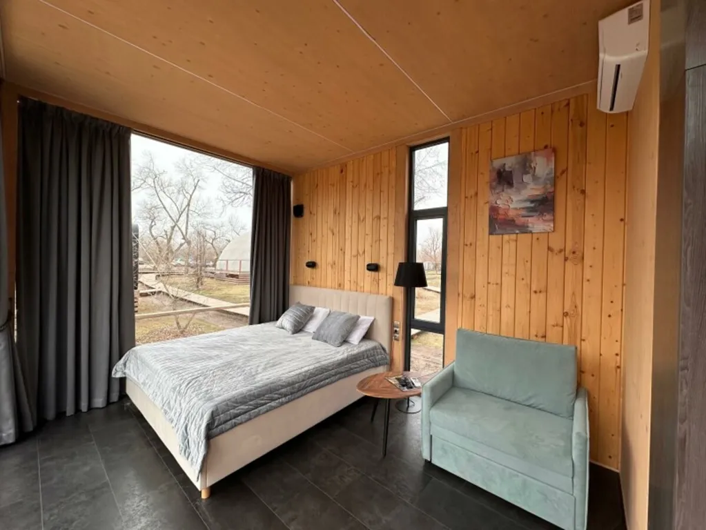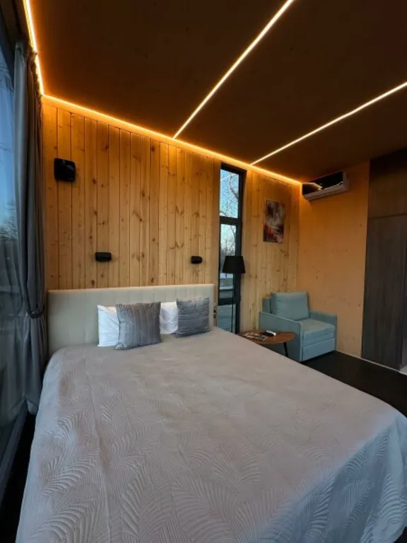 В этом доме вас ждёт уютная двуспальная кровать и дополнительное полутороспальное место на раскладном диване. В доме есть шкаф для одежды, столик, плотные шторы, набор посуды и бокалов, сплит-система, мини-холодильник, а также ванная комната с душевой кабиной. Система отопления в доме — конвекционный тёплый плинтус. В доме установлен телевизор, к которому подключено спутниковое телевидение от «Триколор». Вы сможете наслаждаться любимыми каналами в цифровом качестве.