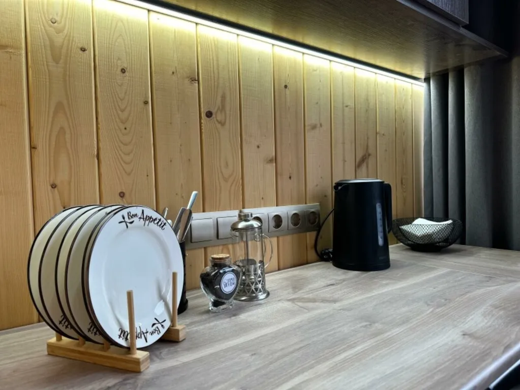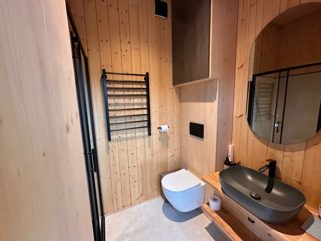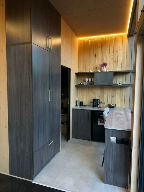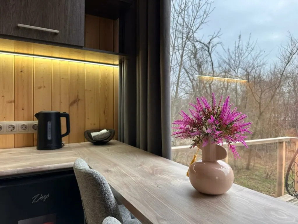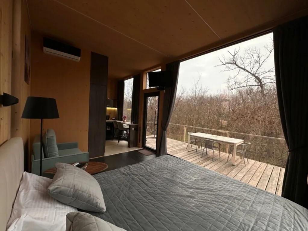 В этом доме вас ждёт уютная двуспальная кровать и дополнительное полутороспальное место на раскладном диване. В доме есть шкаф для одежды, столик, плотные шторы, набор посуды и бокалов, сплит-система, мини-холодильник, а также ванная комната с душевой кабиной. Система отопления в доме — конвекционный тёплый плинтус. В доме установлен телевизор, к которому подключено спутниковое телевидение от «Триколор». Вы сможете наслаждаться любимыми каналами в цифровом качестве.